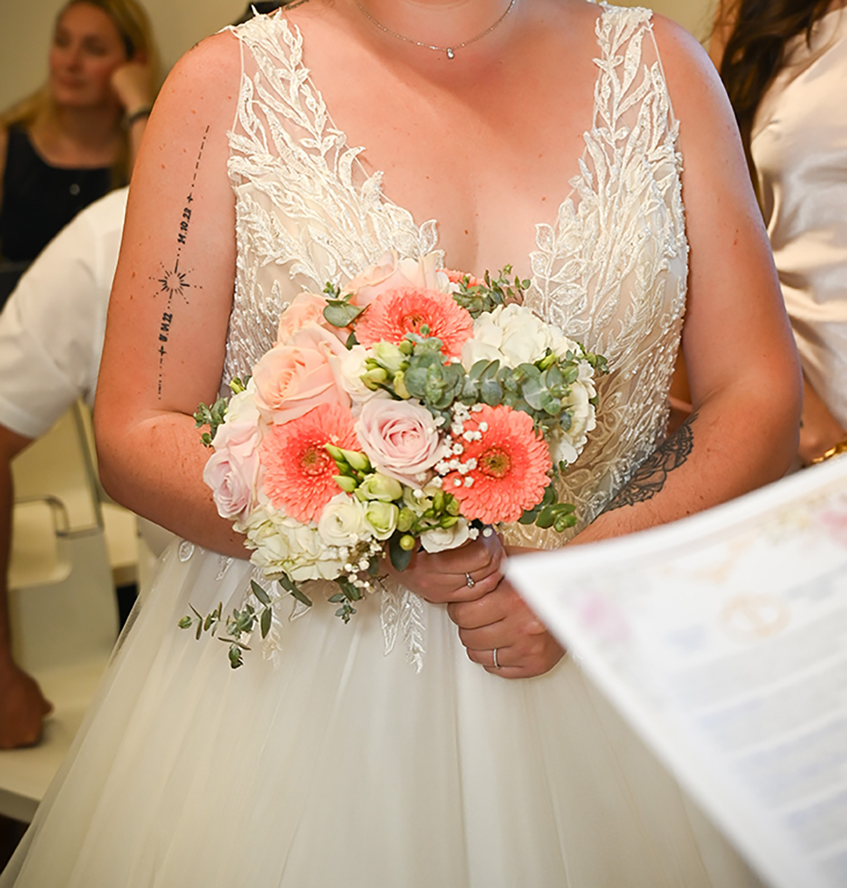 Le bouquet de marié est sans nul doute l’accessoire auquel elle donne le plus d’importance. Fleurs champêtres, roses de jardins, envoutantes, bouquets ronds ou longs, discrets ou majestueux, bigarrés ou monochromes, tout est envisageable. Nous n’oublions pas, bien sûr, les bouquets des demoiselles d’honneur, des mamans des mariés, ou encore la boutonnière du marié assortie au bouquet de la mariée.
