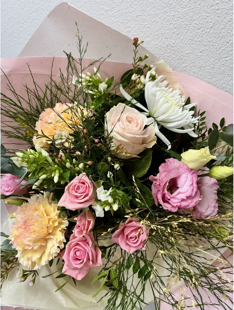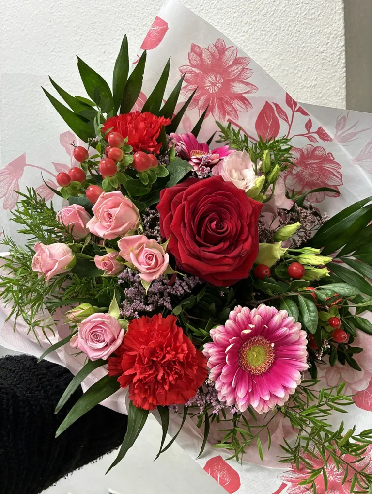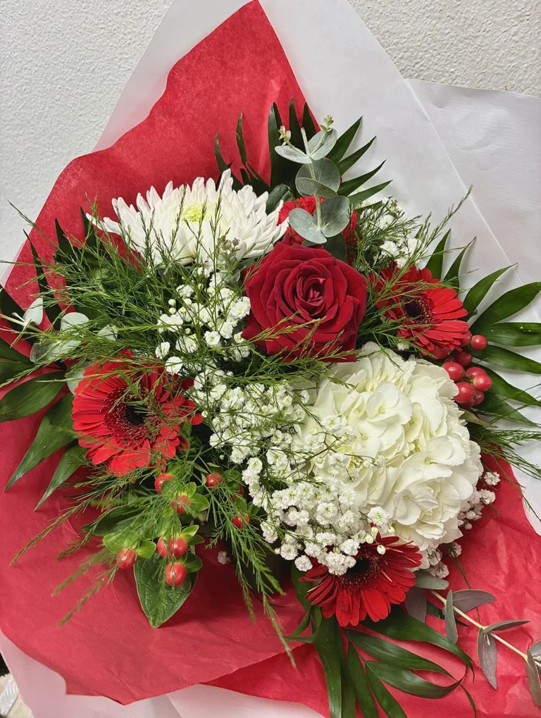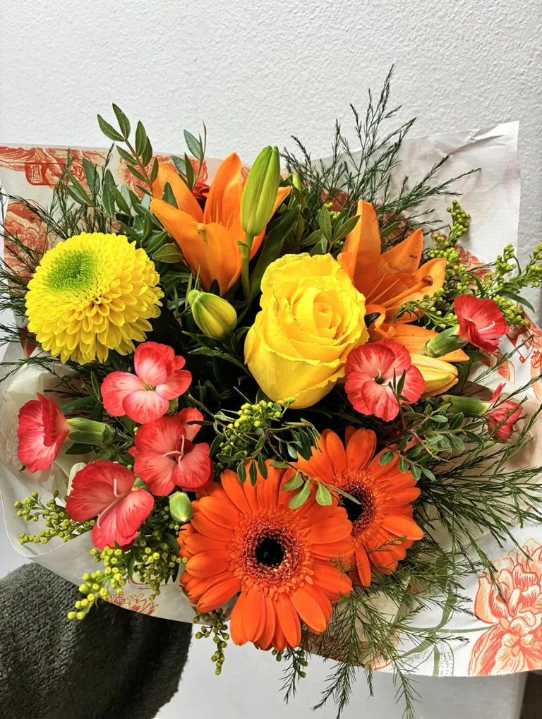 Découvrez l’élégance florale à son apogée avec cette composition artisanale. Gerbera, santini, hypericum, alstroemeria, oeillet, chico